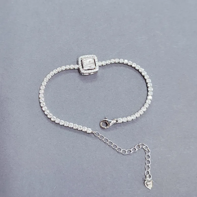Елегантний браслет зі срібла 925 проби, виконаний у класичному тенісному стилі з сучасним акцентом. Основа браслета інкрустована рівномірно закріпленими фіанітами, які створюють суцільну лінію холодного, чистого блиску. Центральний елемент — геометрична вставка квадратної форми з композицією фіанітів багетної огранки, обрамлених дрібними каменями. Така конструкція додає виробу архітектурної чіткості та підкреслює трендовий характер прикраси. Браслет оснащений надійним карабінним замком та подовжувальним ланцюжком, що дозволяє комфортно регулювати посадку на зап’ясті. Модель універсальна: підходить як для щоденного носіння, так і для завершення вечірнього образу.