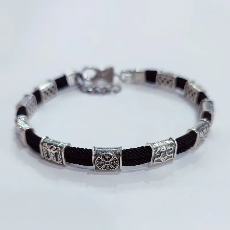 Чоловічий браслет виконаний у стильному поєднанні чорного шнура та срібних елементів. Основа – міцний чорний текстильний шнур із плетенням, що надає виробу брутального та сучасного вигляду. Браслет прикрашений вставками зі срібла у вигляді циліндричних елементів з різьбленими символами: Світове Дерево, Іггдрасіль, Валькірій, Одні на Слейпнірі, Валькнут, Хугін та Мунін, Шолом Жаху, Соломонові вузол, Молот Тора, Світовий змій Йормунганд, Вегвізир. Такий аксесуар підкреслює силу й характер власника, пасує як до повсякденного стилю, так і до більш стриманого класичного образу. Завдяки регулюванню довжини браслет зручно сідає на руку. Ідеальний вибір для чоловіка, який цінує поєднання мужності, символізму та сучасного дизайну.