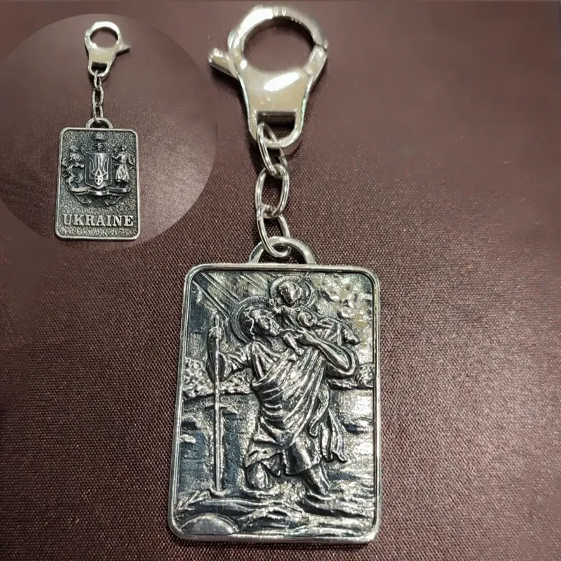 Це прямокутний кулон-брелок із рельєфним зображенням святого Христофора, який несе на плечах дитину — Ісуса Христа. Святитель зображений у динаміці, з посохом у руці, переходить ріку, що символізує допомогу у важких життєвих шляхах. Над його головою видно німб — знак святості, а промені світла позаду підкреслюють божественну присутність. Кулон виконаний із срібла 925 проби, з чітким об’ємним рельєфом, що надає зображенню глибини та духовного змісту. Наділений не тільки естетичною привабливістю, а й сакральною силою — Святий Христофор вважається покровителем мандрівників, водіїв, військових і тих, хто знаходиться в дорозі. Завдяки зручному металевому карабіну цей кулон можна легко прикріпити до ключів, сумки або рюкзака. Це не просто прикраса, а своєрідний оберіг для щоденного захисту та духовної підтримки. Чернений.