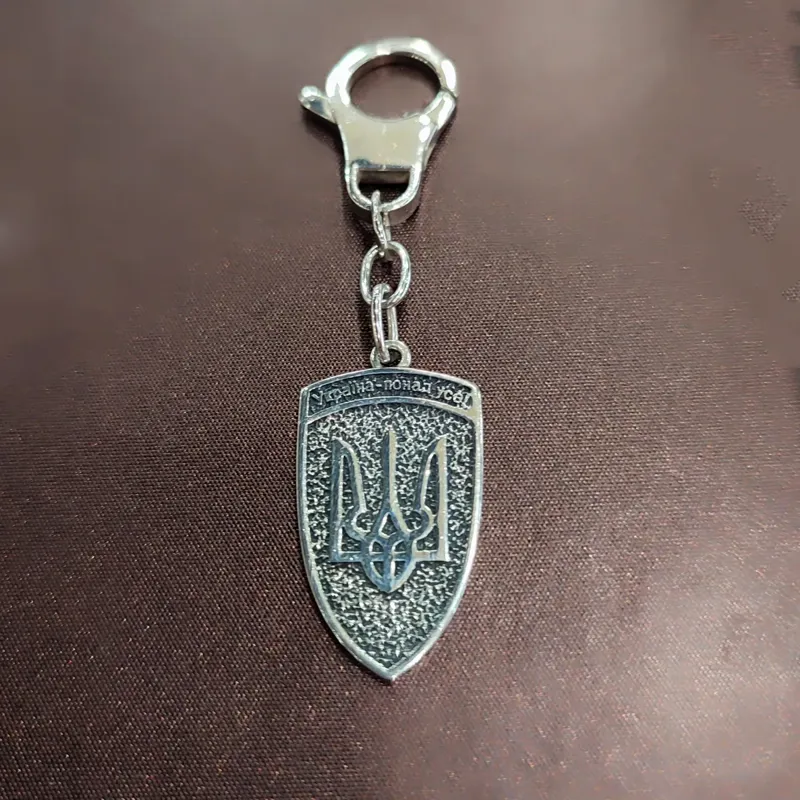 Брелок з зображенням тризуба, з натільної сторони молитва. Зроблений із срібла 925 проби. Чернений.