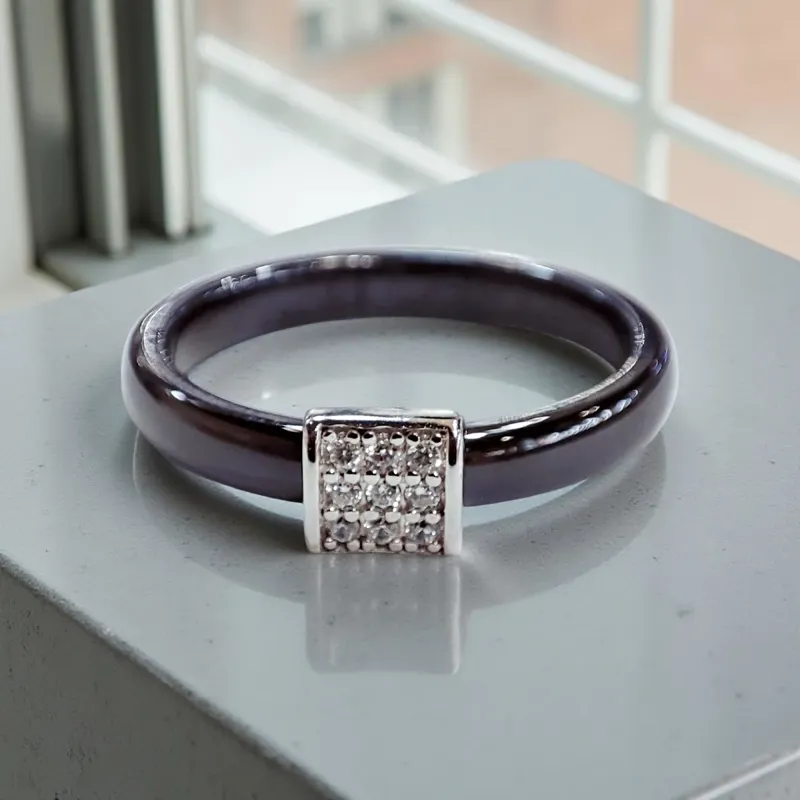 Каблучка із чорної кераміки, з сріблом 915 проби, родоване, вставка -фіаніти.