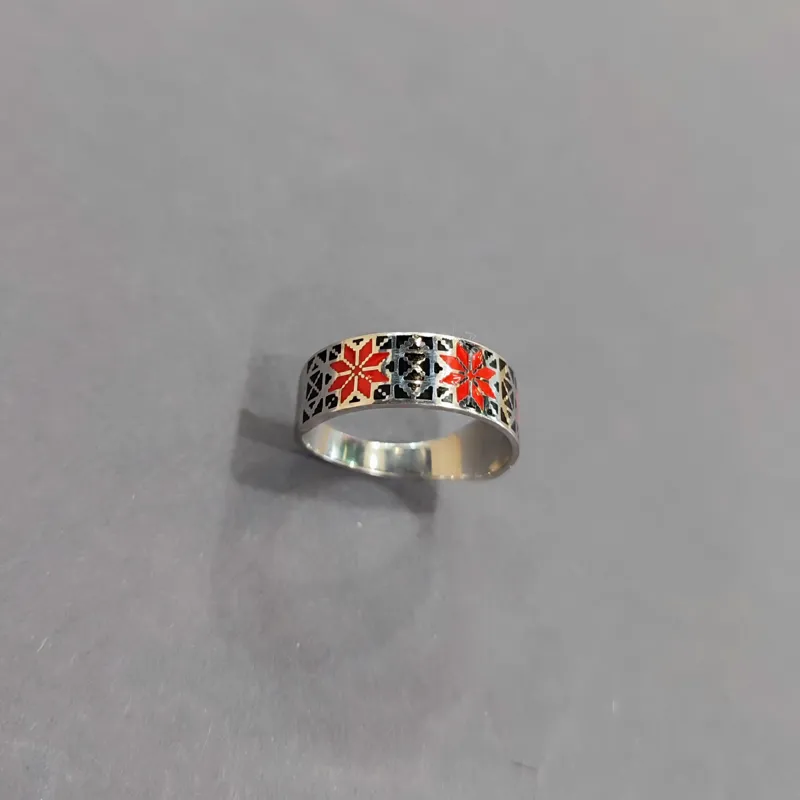 Срібна каблучка з емаллю, декорована геометричним червоно-чорним орнаментом, що повторює мотиви української вишивки. Такий малюнок асоціюється із символікою захисту, сили духу і спадкової пам'яті. Червоний — колір життя та енергії, чорний — глибини та стабільності. Разом вони створюють традиційне поєднання, яке здавна вважалося обереговим. Каблучка стане вдалим вибором для поціновувачів етно-стилю, патріотичних прикрас, орнаментальних каблучок зі срібла, аксесуарів із символічним змістом та українських традицій. Підтримує українську ідентичність у сучасному читанні.