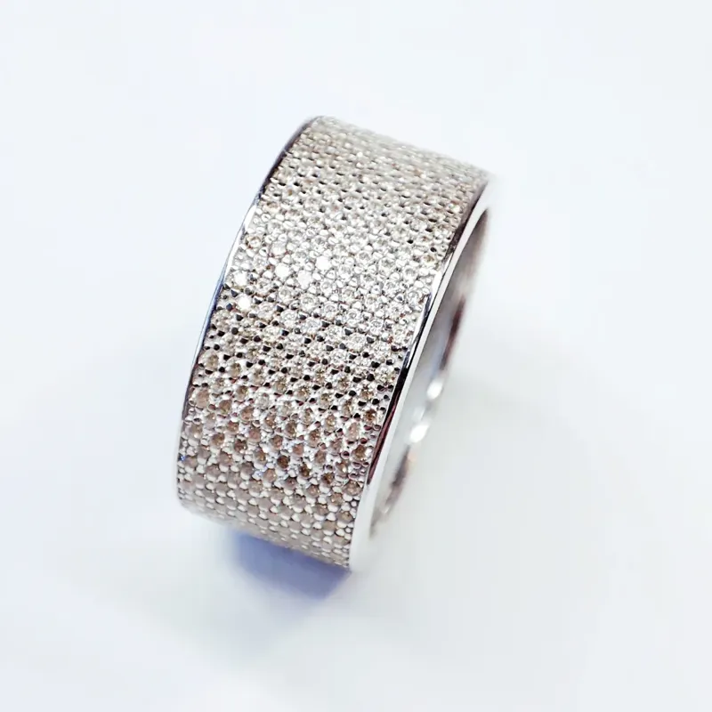 Каблучка із срібла 925 проби. Покриття родієм. Вствки фіаніти. Широка, усипана фіанітами по колу.
