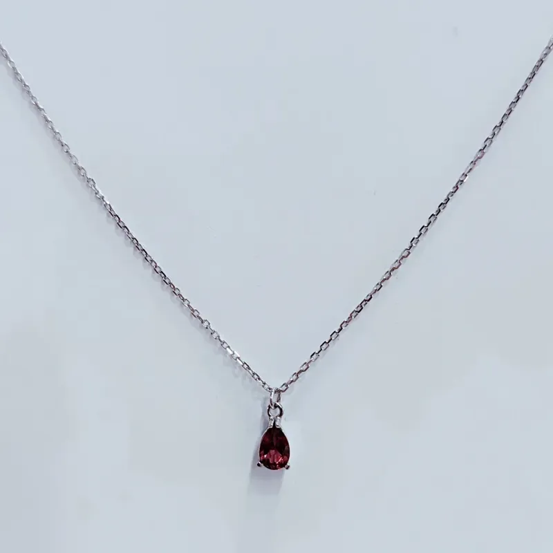 Ніжне кольє із срібла 925 проби. З підвіскою у вигляді каплі із натурального гранату. Родоване, з декілька ми варіантами довжини.