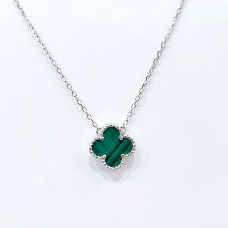 Одна велика конюшинка-чотирилисник прикрашає це ніжне кольє, надаючи йому елегантності та символічності. Вставка з натурального малахіту підкреслює природну красу прикраси. Якірний ланцюжок із родованим покриттям забезпечує блиск та захист від потемніння, а регульована довжина дозволяє комфортно носити кольє на будь-якому образі. Приблизний розмір підвіски 13 мм