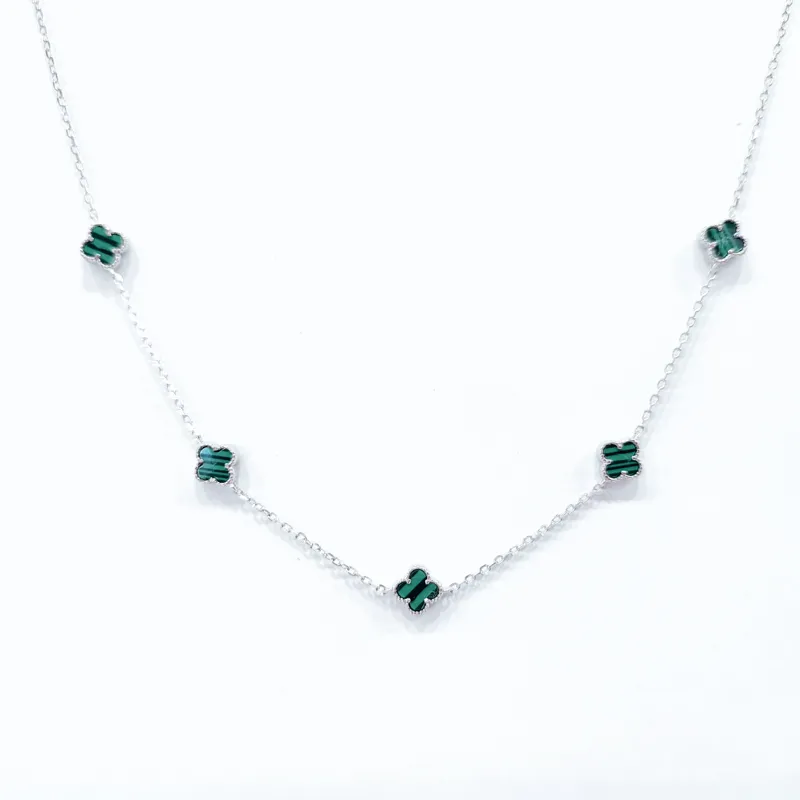 Маленькі витончені конюшинки-чотирилисники надають кольє грайливості та ніжності. Вставки з натурального малахіту підкреслюють природну красу прикраси. Якірний ланцюжок із родованим покриттям і замочок-карабін забезпечують зручність і надійність носіння. Довжина кольє регулюється для ідеальної посадки на будь-якому образі. Приблизний розмір квіточки: 6 мм