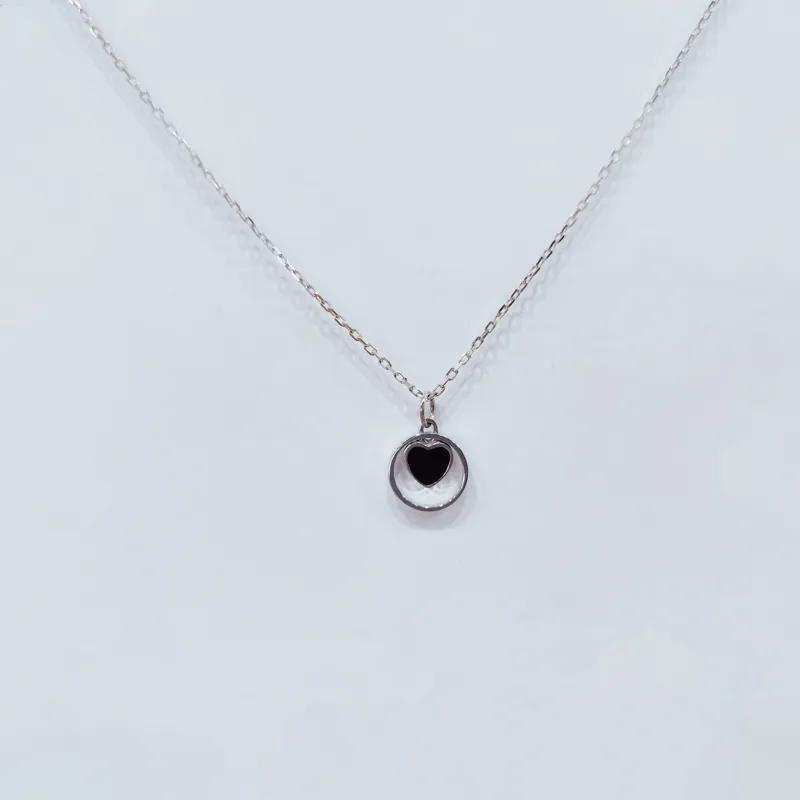 Ніжне срібне кольє з підвіскою у вигляді сердечка з чорною емаллю в центрі. Сердечко розміщене в витонченому колі, що надає прикрасі глибини та символічності. Родоване покриття забезпечує благородний блиск і захист від потемніння. Довжина кольє регулюється для комфортного носіння.