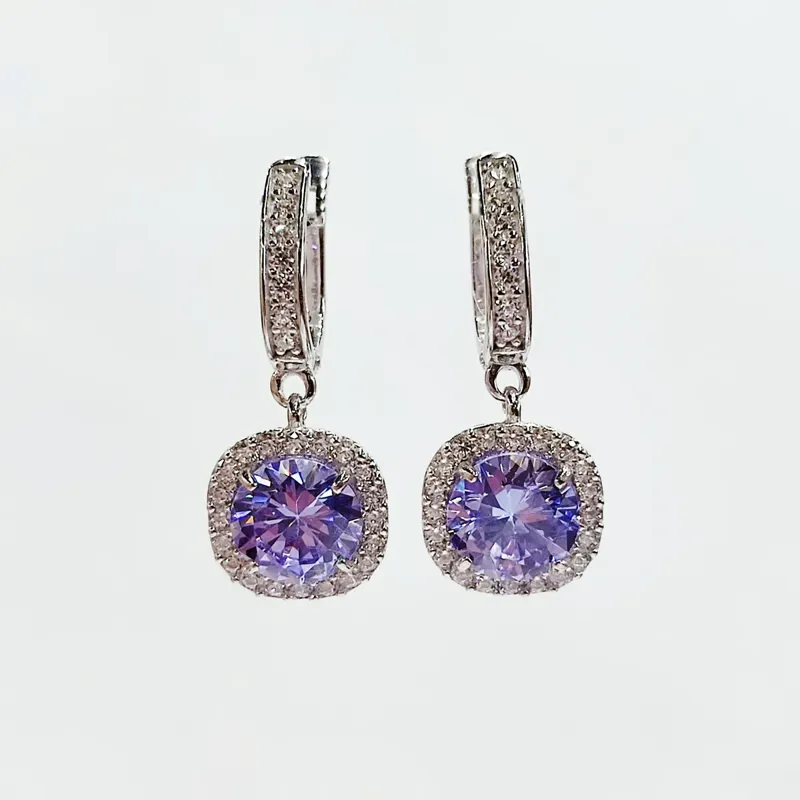 Сережки із срібла 925 проби. Родовані. Вставки- куб. цирконій Колір центрального каменя -свіьлий аметист ( може бути невелика різниця кольору як на фото та реального ) Англійський замок. Довжина 27 мм Ширина передньої частини 12 мм