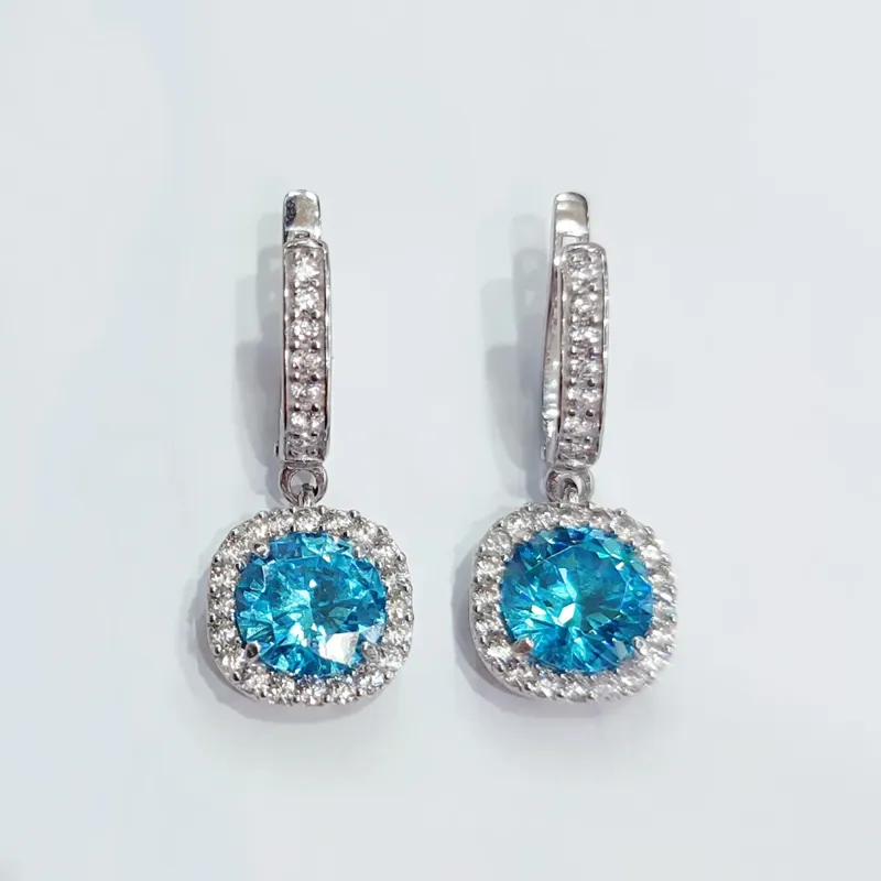 Сережки із срібла 925 проби. Покриття-родієм. Вставка кубічний цірконій. Центральний камінь блакитного кольору. Вісюльки.