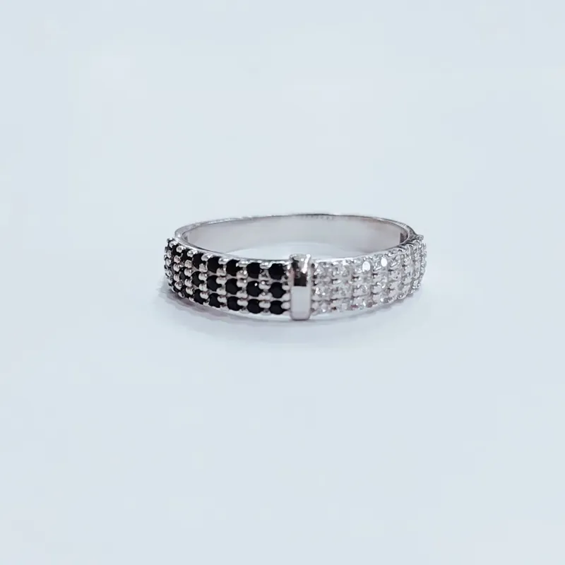 Вишукана срібна каблучка у сучасному стилі, що поєднує блиск білих і глибину чорних фіанітів. Контраст каменів створює ефект елегантності та сили, а родійне покриття додає дзеркального сяйва й захищає від потемніння. Матеріал: срібло 925 проби Покриття: родій Вставки: фіаніти білого та чорного кольору Стиль: сучасна класика Ця каблучка стане стильним акцентом у вашому образі — гармонійно доповнить як вечірній, так і повсякденний look.