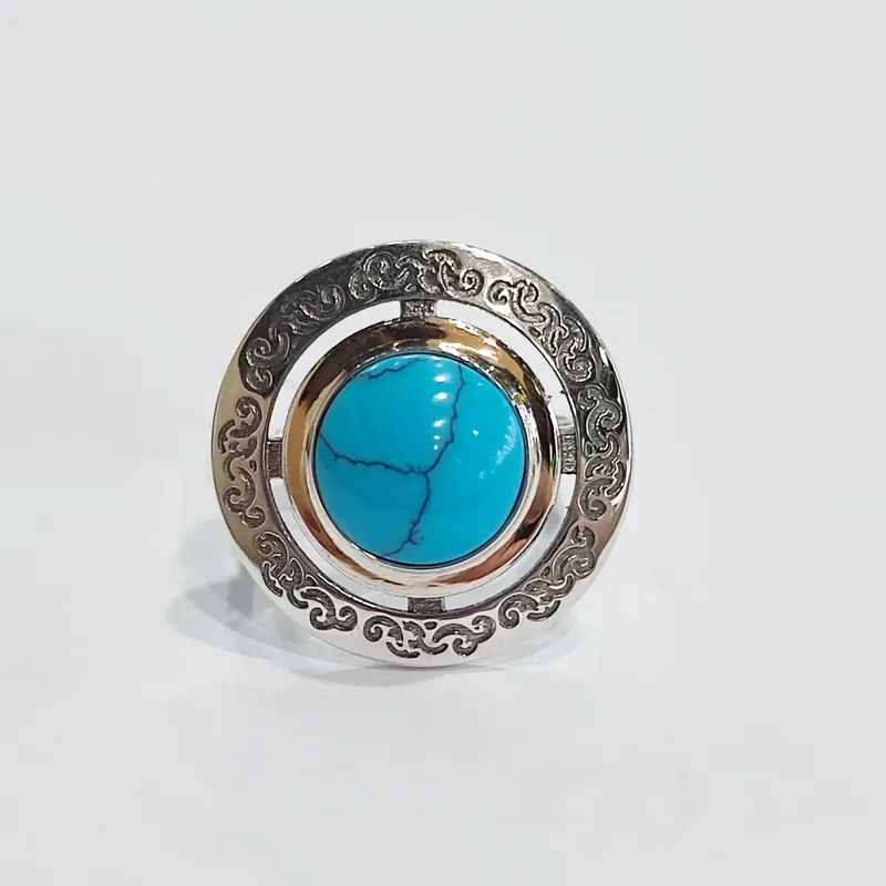 Срібна каблучка з бірюзою у витонченому етнічному стилі. Центральний елемент – яскравий блакитний камінь з природним малюнком прожилок, обрамлений гладкою окантовкою та ажурним орнаментом. Така каблучка виглядає яскраво та самобутньо, поєднуючи елегантність срібла з енергією натурального каменю. І
