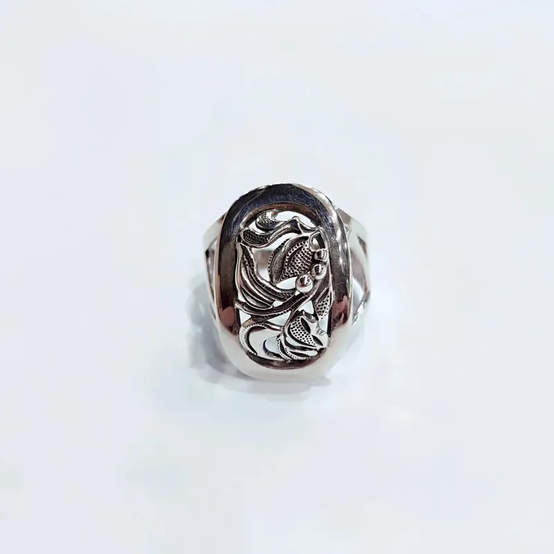 Вишукана срібна каблучка, виконана у формі овальної пластини з ажурним рослинним візерунком. Ніжне переплетіння листя та ягід створює витончений об’єм і надає прикрасі особливого шарму. Срібло 925 проби має благородний блиск і підкреслює кожну деталь майстерної роботи. Така каблучка пасуватиме як до повсякденного образу, так і до особливих нагод — вонп додає елегантності та відчуття стилю.