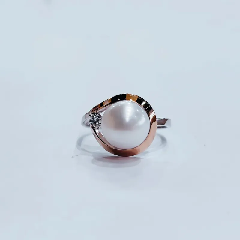 Вишукана каблучка зі срібла 925 проби з родієвим покриттям. У центрі — ніжна перлина, вишукано обрамлена золотою пластиною, що створює гармонійне поєднання холодного блиску срібла й теплого сяйва золота.