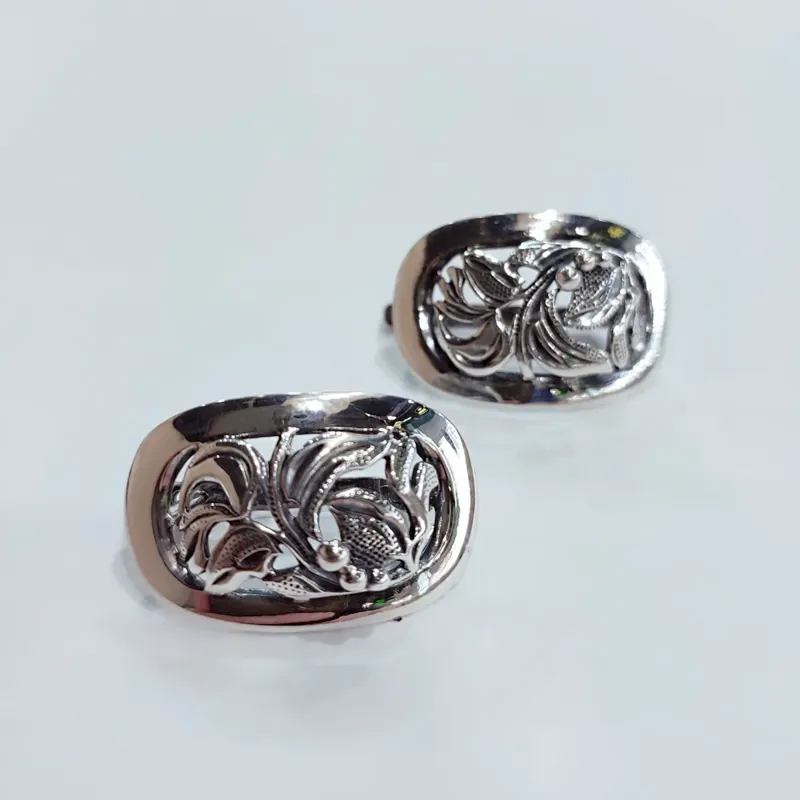 Вишукані срібні сережки, виконані у формі овальної пластини з ажурним рослинним візерунком. Ніжне переплетіння листя та ягід створює витончений об’єм і надає прикрасі особливого шарму. Срібло 925 проби має благородний блиск і підкреслює кожну деталь майстерної роботи. Такі сережки пасуватимуть як до повсякденного образу, так і до особливих нагод — вони додають елегантності та відчуття стилю. Довжина - 27 мм Ширина - 19 мм