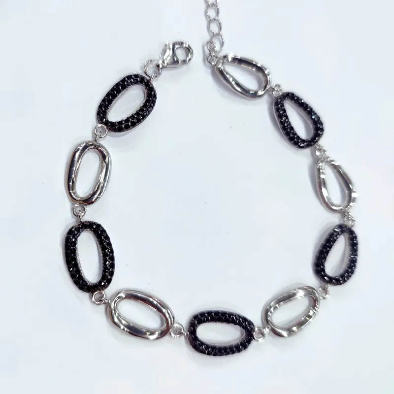 Вишуканий срібний браслет, виконаний у комбінованому дизайні: гладкі поліровані овальні ланки поєднані з ланками, інкрустованими чорними фіанітами. Контраст металу й темного каміння створює стильний, сучасний акцент, який легко підкреслює індивідуальність. Браслет має регулювання довжини, тому комфортно підійде на будь-яке зап’ястя. Легка вага та акуратне виконання роблять його зручним для щоденного носіння. Матеріал: срібло 925 проби Вставки: чорні фіаніти Дизайн: комбіновані овальні ланки Застібка: карабін Стиль: сучасний, елегантний, мінімалістичний Це прикраса, яка додає образу впевненості й стриманої виразності — доречна як на щодень, так і для більш особливих виходів.