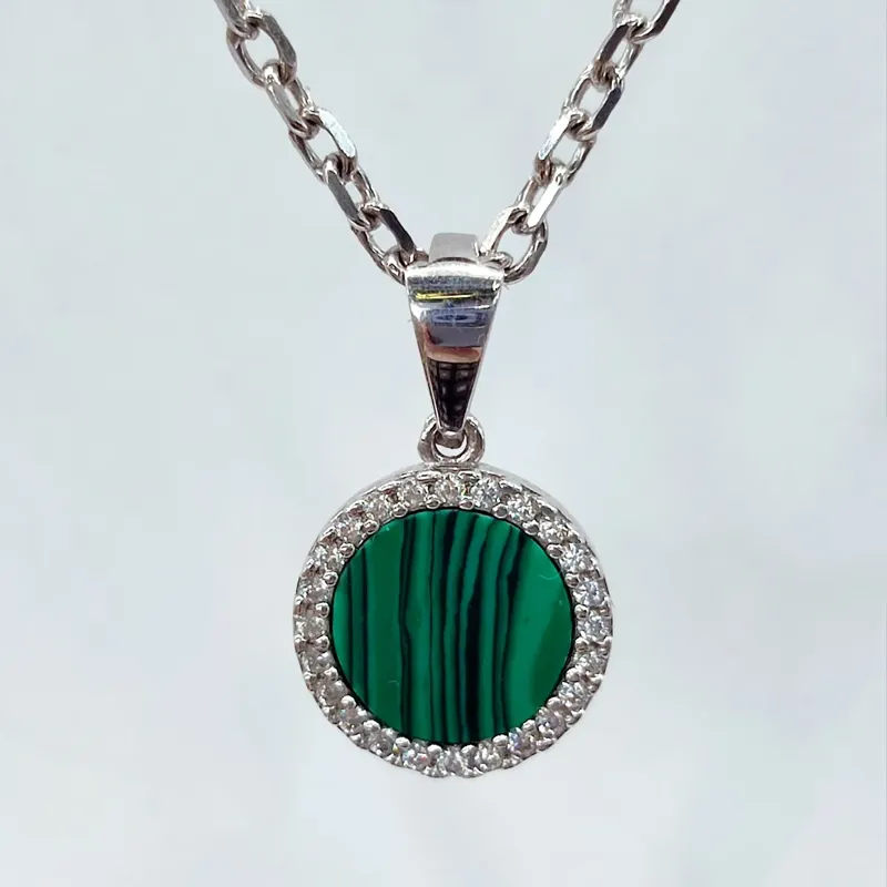 Срібний ланцюжок класичного якірного плетіння з круглою підвіскою з натурального малахіту. Глибокий зелений камінь із природним візерунком смуг підкреслений обрамленням із прозорих фіанітів, що надають виробу виразності та сучасного блиску. Характеристики: Матеріал: срібло 925 проби Вставка: натуральний малахіт Додатково: фіаніти Покриття: родій Плетіння: якірне Форма підвіски: кругла ✅ Ланцюг: вага 5.65г, ціна 2030 грн ✅ Підвіска: вага 1.85г, ціна 900 грн Приблизна довжина кулона: 2.0 см. Ланцюжок із підвіскою виглядає стильно та стримано. Підходить як для повсякденного носіння, так і для ділових чи вечірніх образів.