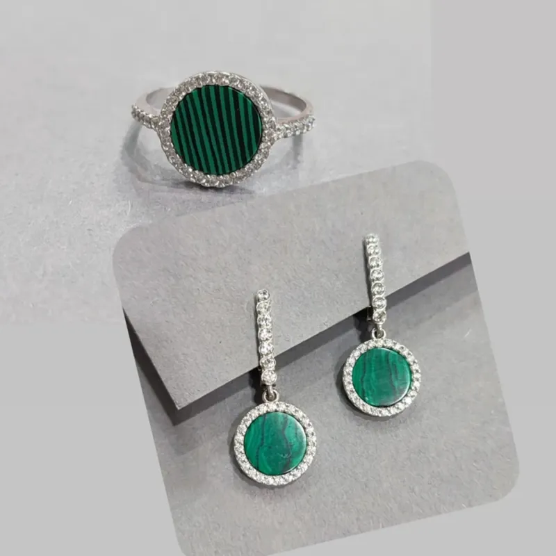 Стильний набір прикрас із срібла 925 проби, що складається з сережок і каблучки з натуральним малахітом. Камінь має характерний зелений відтінок із природним малюнком смуг. Вставки обрамлені прозорими фіанітами, які додають прикрасам блиску та вишуканості. Характеристики: Матеріал: срібло 925 проби Вставка: натуральний малахіт Додатково: фіаніти Покриття: родій Комплектація: сережки + каблучка Форма вставки: кругла, вісюльки. Приблизна довжина: 3.0 см, коло: 1.3 см ✅ Сережки: вага 5.05г - ціна 2500 грн ✅ Каблучка: вага 2.7г - ціна 1400 грн, 20 розмір. Набір підкреслює природну красу й гармонію, пасує до класичного та ділового стилю. Підходить для щоденного носіння або як подарунок.