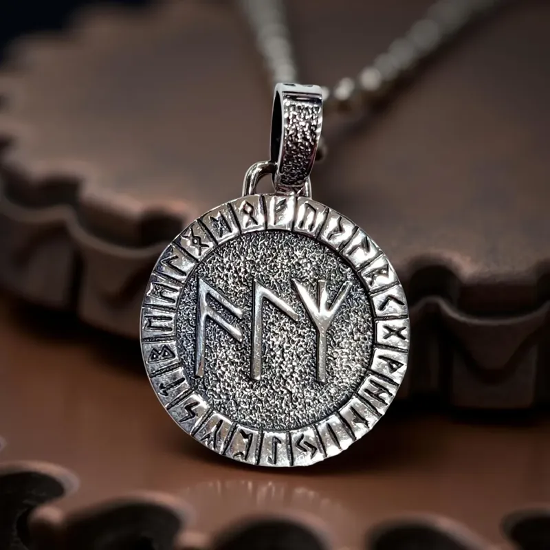 Оберіг для тих, хто прагне достатку, удачі та захисту. У центрі кулона викарбувані стародавні руни Fehu (багатство) та Algiz (захист), що символізують притягнення матеріальних благ і водночас охорону від негативу. Подвійний знак Algiz підсилює дію оберега, створюючи потужне енергетичне коло. Край підвісу прикрашений написом у вигляді повного рунічного кола старшого Футарка, яке слугує символом цілісності, гармонії та сили предків. Такий амулет стане не лише стильним аксесуаром, а й особистим талісманом удачі та внутрішньої сили.